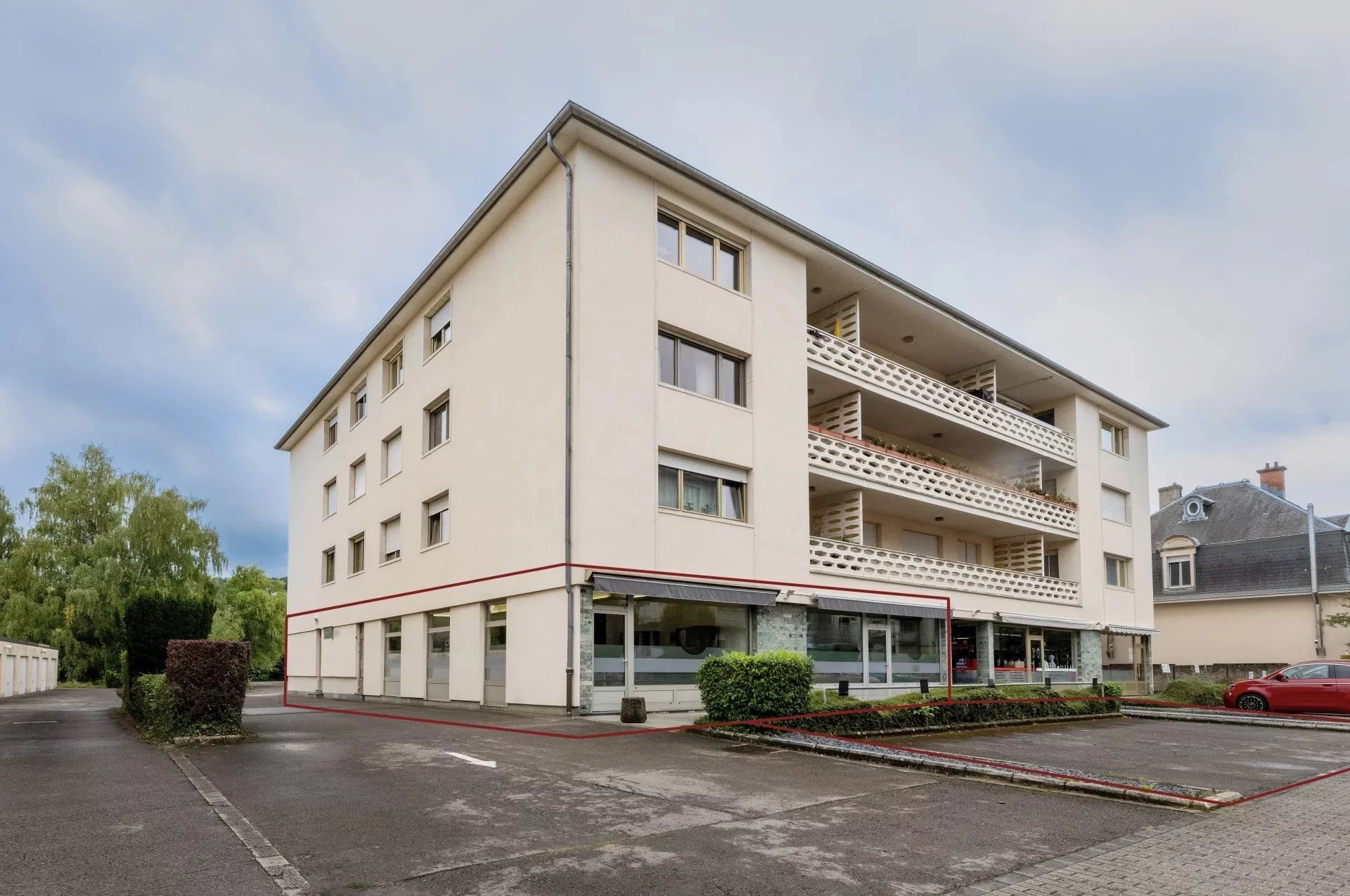 Le local dispose de plusieurs entrées indépendantes et de larges vitrines assurant une visibilité optimale, ainsi que de 5 emplacements de parking privatifs devant la résidence.