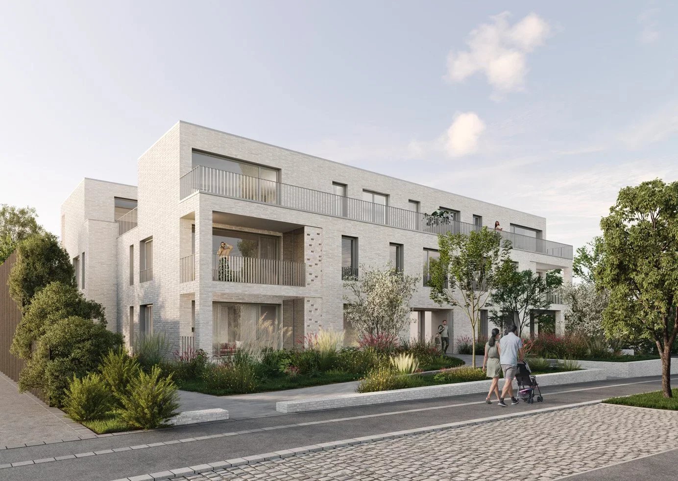 La façade, élégante et sobre, associe briques claires, larges baies vitrées et garde-corps soignés. Elle est sublimée par une végétation dense, créant un écrin de verdure qui préserve l’intimité des résidents.