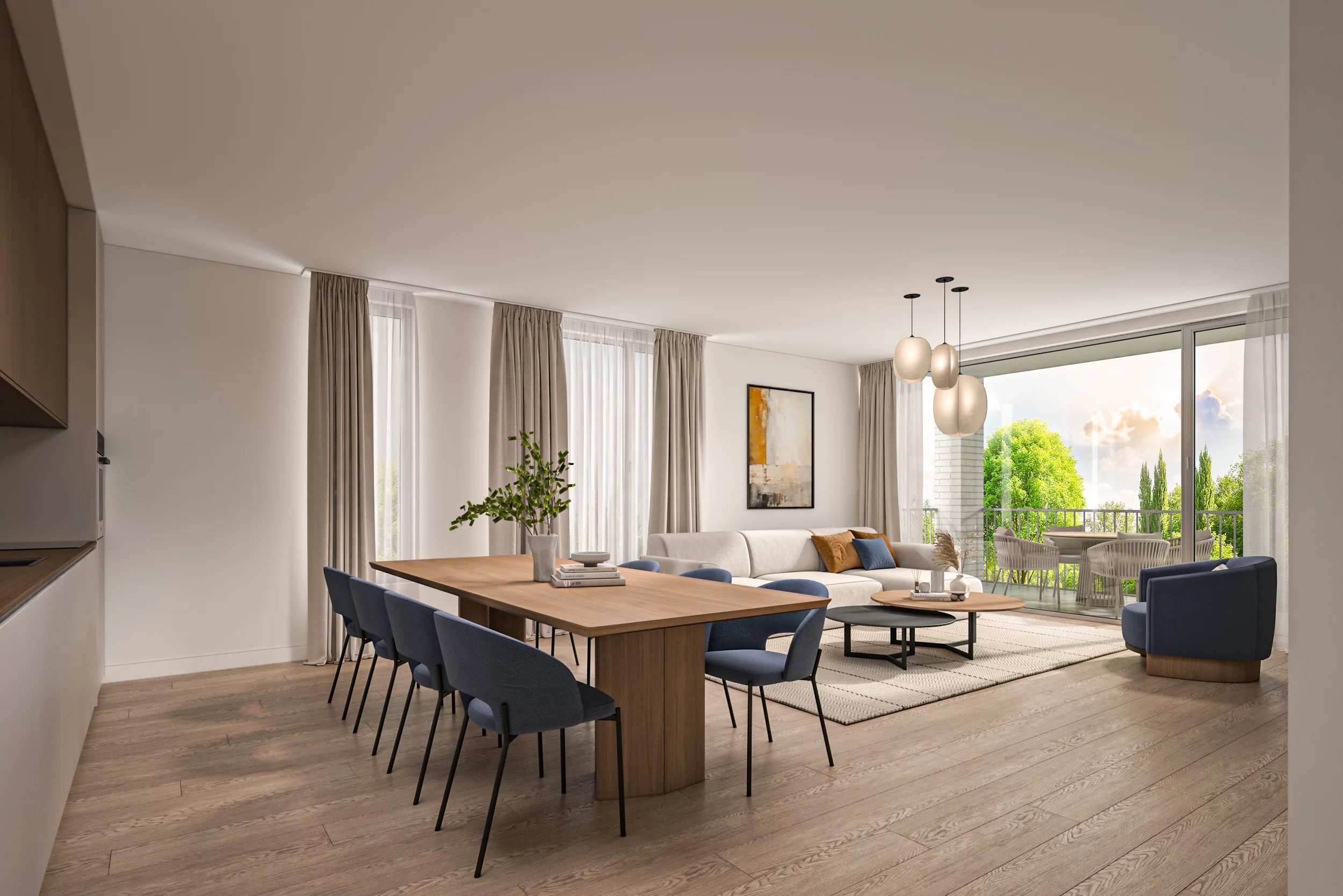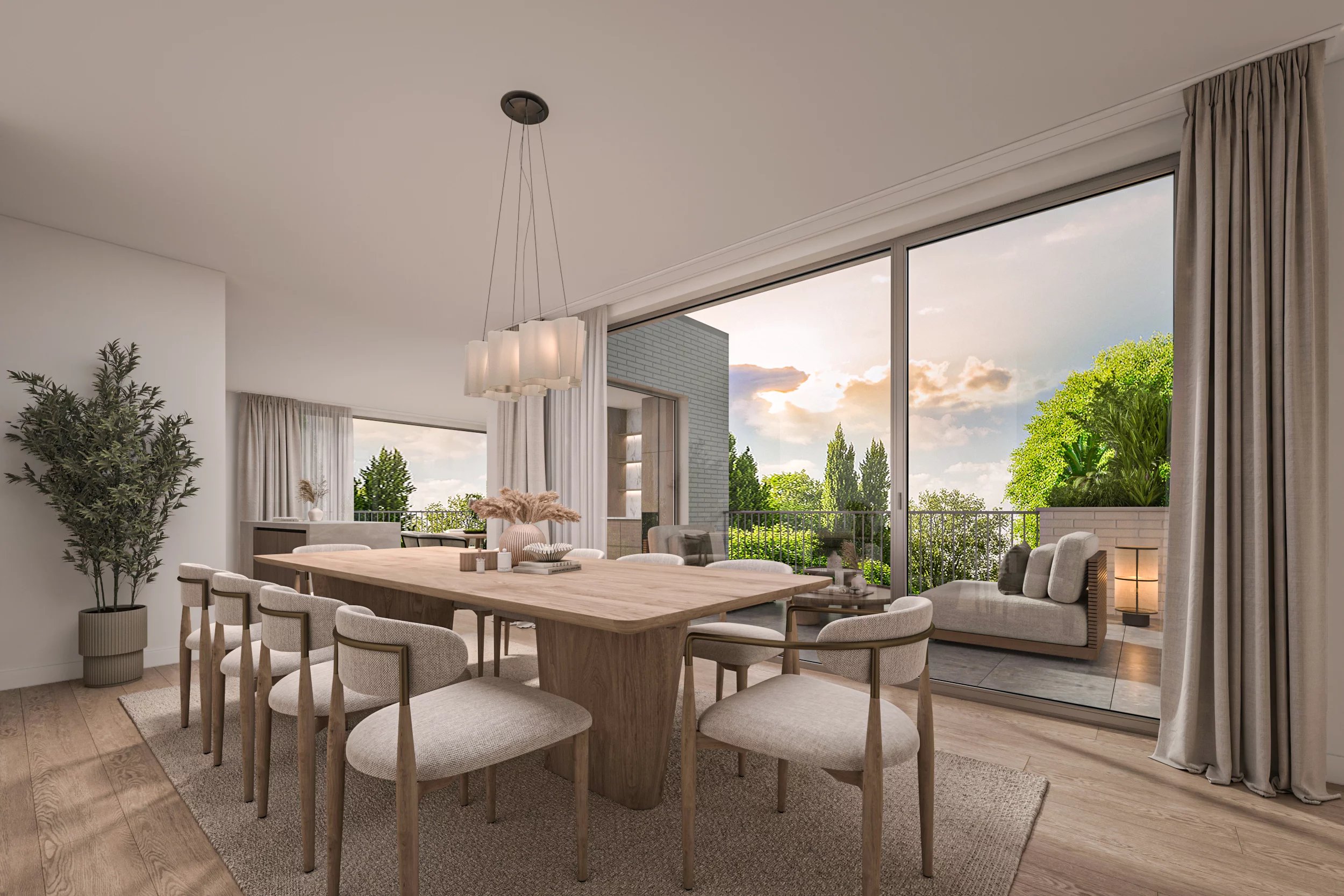 Un séjour – salle à manger avec accès à la terrasse de 24 m² et au jardin privatif