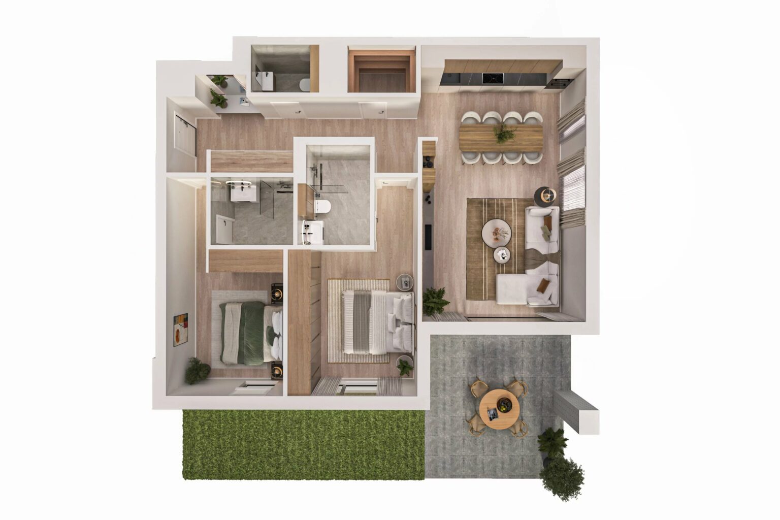 - Accès à la terrasse de 19 m² et au jardin privatif de 19 m²