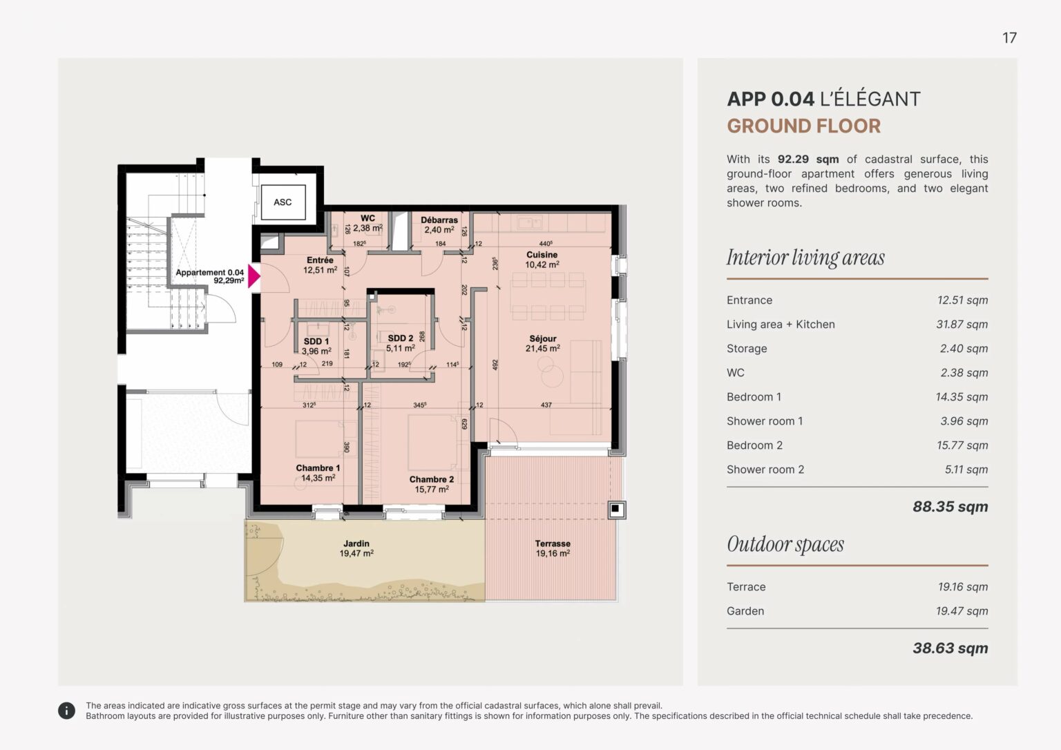 L'appartement 0.04 de 92 m² situé au rez-de-chaussée se compose comme suit :