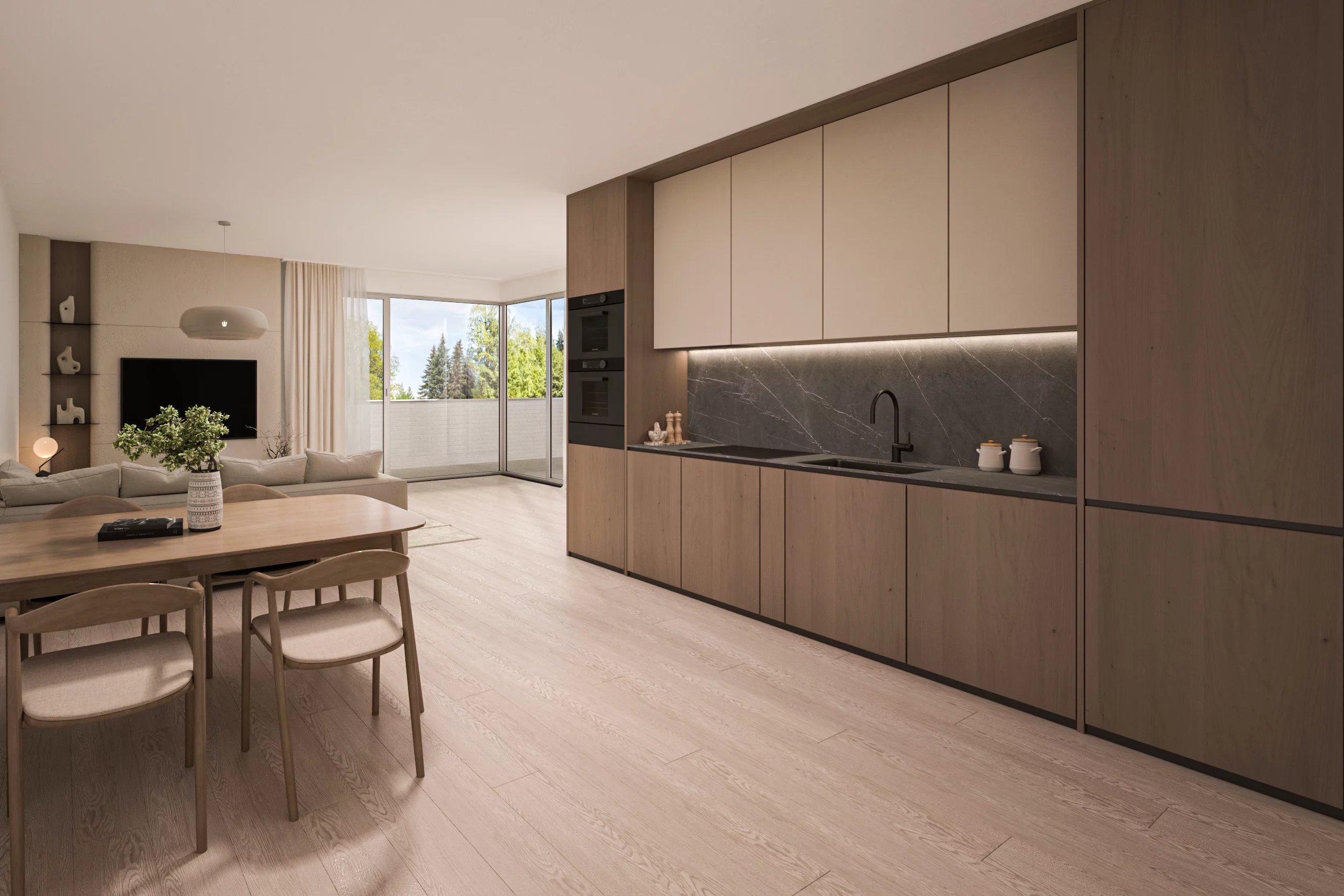 – Un séjour avec cuisine ouverte (25,94 m²) avec accès à la loggia (7,33 m²)
